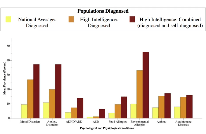 The survey included a multiple anxiety and mood disorders, ADHD and autism. The authors of the study compared 3715 members. Results where[BR1]  mind boggling as they showed that highly intelligent people are 20 % more likely to be diagnosed with autism 80% more likely to have ADHD, 182% more likely to have at least one mood disorder and 83 % more likely to have anxiety, these numbers are concerning  but what comes next is even more staggering as the research further shoed that highly intelligent people are 84 % more likely to have an immune system disease, 108% more likely to have asthma and 213% more likely to have allergies